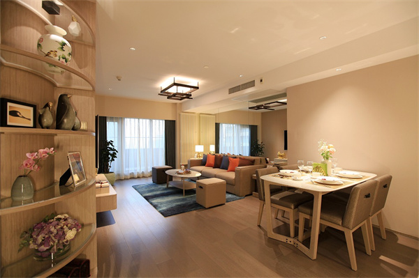 该户型是焕新升级后主打家庭与精英管理层的服务式公寓产品,面积为99㎡(使用面积),两房两卫、独立客餐区 + 开放式厨房 的格局,兼具私密性与社交功能,适配 CBD 长期居住或商务家庭需求。